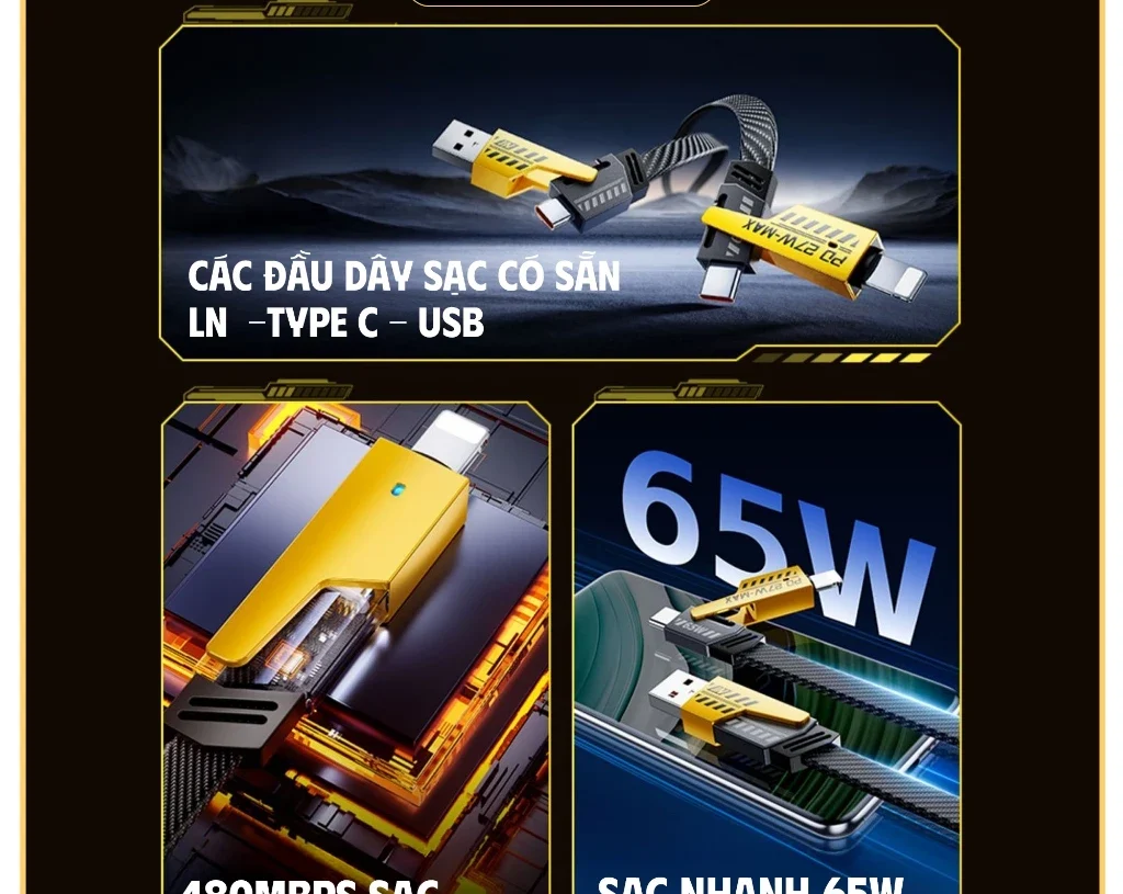 Dây cáp sạc nhanh đa năng 4in1 ORIO là sự lựa chọn hoàn hảo cho những ai cần một giải pháp sạc tiện lợi, bền bỉ và hiệu suất cao. Với thiết kế cao cấp cùng công suất sạc lên đến 65W, sản phẩm đáp ứng nhu cầu sạc nhanh cho nhiều thiết bị khác nhau, từ điện thoại, máy tính bảng đến laptop hỗ trợ sạc Type-C PD.
