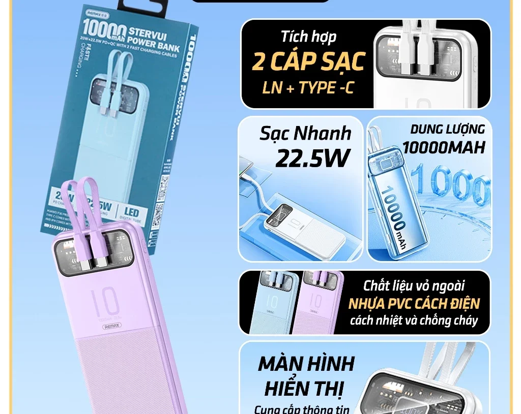 Sạc Dự Phòng ReMax 10000mAh với các đặc điểm sau: