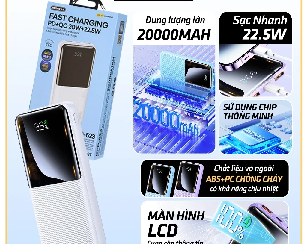 Sạc Dự Phòng ReMax 20000mAh, Sạc Nhanh 22.5W ,Có Màn Hình Hiển Thị , Nhựa ABS Chống Cháy ORIO